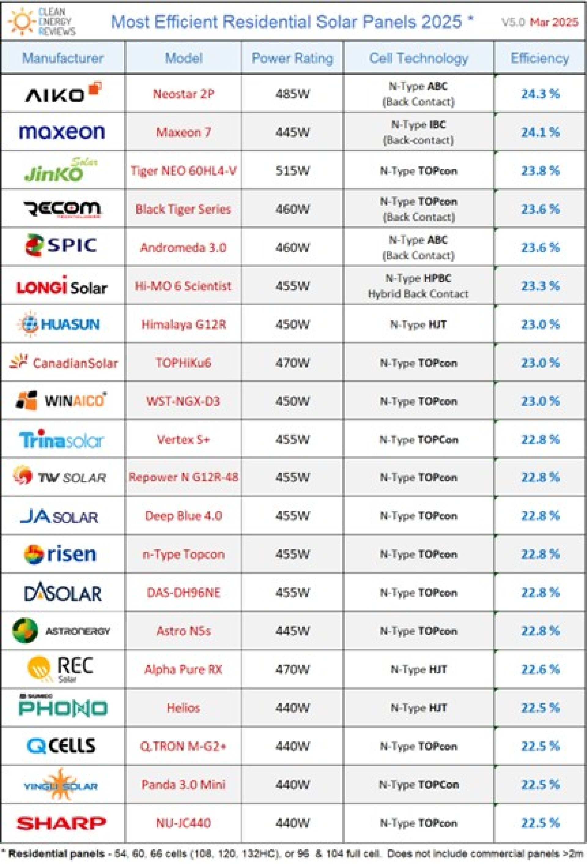 แผงโซลาร์เซลล์ที่มีประสิทธิภาพสูงสุดในปี 2025